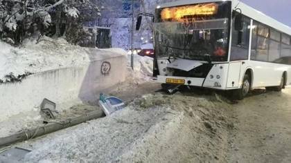 Предположительно, водитель рейсового автобуса не справился с управлением, из-за чего транспортное средство врезалось в опору освещения.