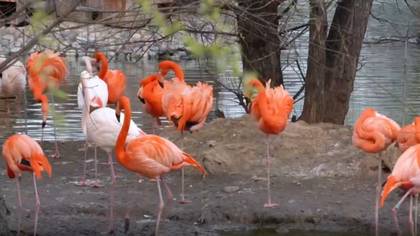 — На улице потеплело — и наши розовые и красные фламинго переселились на открытую воду. Буквально через полчаса после выхода пары начали присматривать места для гнездования, притаптывать глину, — говорится в сообщении.