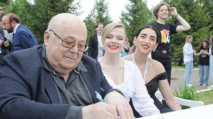 Народный артист России Александр Калягин вместе с ученицами XV международной школы Екатериной Сиротко и Арменуи Акопян (слева направо) / Фото: Пелагия Замятина / Вечерняя Москва