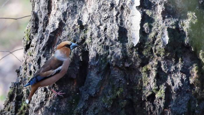 — Встретить дубоноса — большая удача. В основном эта осторожная птичка прячется в кронах деревьев, там же строит гнезда. Яйца у дубоноса необычной окраски: на желтовато-сером фоне синие пятна и завитушки, — говорится в сообщении.