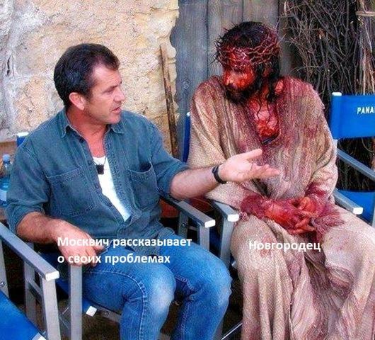 На фото — режиссер фильма «Страсти Христовы» Мэл Гибсон и актер Джеймс Кэвизел, сыгравший главную роль в евангельской драме. Гибсон что-то говорит артисту, рядом с режиссером подпись «Москвич рассказывает о своих проблемах». Кэвизел, находясь в образе окровавленного Христа в терновом венце, подписан как «Рязанец».
