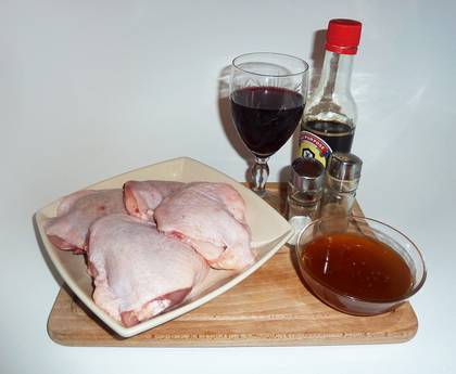 На две порции нам понадобятся: четыре куриных бедрышка, по 100 граммов меда, сухого вина и соевого соуса, 3–4 зубчика чеснока, соль и молотый черный перец. Курятину рекомендую брать охлажденной: конечное блюдо при этом всегда будет сочнее и мягче. Возможно, это отголосок моего детства, проведенного в южных регионах России, но замороженное мясо мои многочисленные родственницы не воспринимали всерьез, ставя в один ряд с сублимированной лапшой и кубиками для бульона.