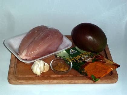 Объявляем музыкальную паузу — что-нибудь конца прошлого века — и изучаем сегодняшний рецепт: курица жареная с манго. На две порции нам потребуются: грудка куриная, одно манго, столовая ложка дижонской горчицы, пара зубчиков чеснока, масло для жарки, куркума, соль по вкусу.