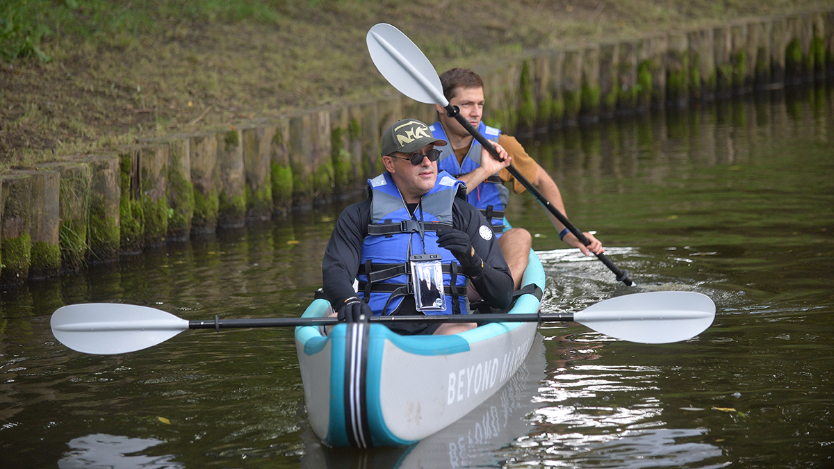 Председатель Мосгордумы Алексей Шапошников с инструктором Владимиром Казанским сплавляются на байдарке по Яузе, чтобы оценить необходимость очистки и углубления ее русла / Фото: Александр Кочубей / Вечерняя Москва