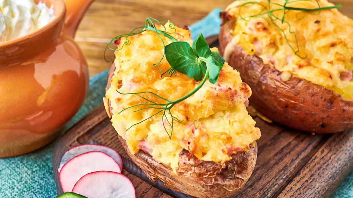 Приготовленная таким образом картошка запомнится своим необычным вкусом. Картофель оберните фольгой и выпекайте 45 минут при температуре 200 градусов. Ветчину мелко нарежьте и смешайте со сливочным сыром. Из картофеля уберите мякоть, посолите ее немного и смешайте с сырной смесью. Нафаршируйте картофель, посыпьте натертым сыром. Отправьте картошку вновь в духовку и выпекайте при температуре 170 градусов, пока сыр не расплавится и не появится аппетитная корочка.