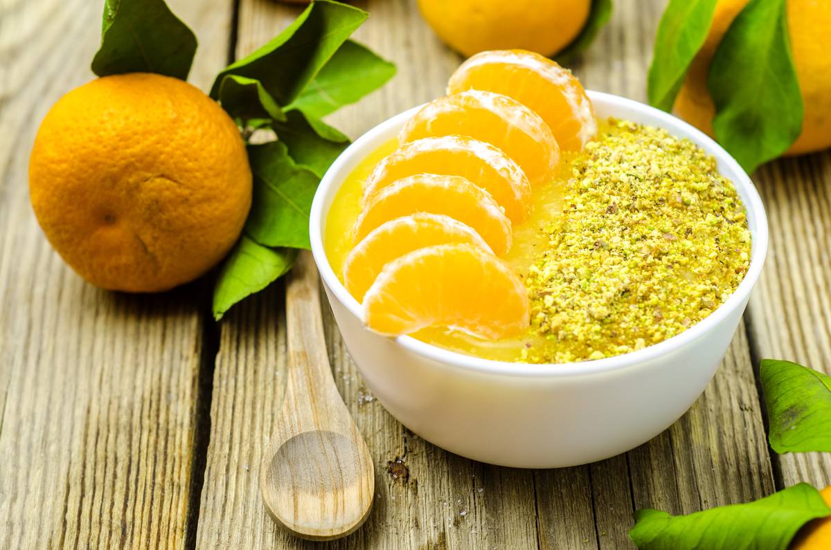 Добавьте 2/3 орехов. Разлейте по порционным тарелкам и дайте застыть. Мандарины очистите от кожуры и разделите на дольки. Они необходимы для украшения. Выложите их по краю тарелки и добавьте немного орехов.
