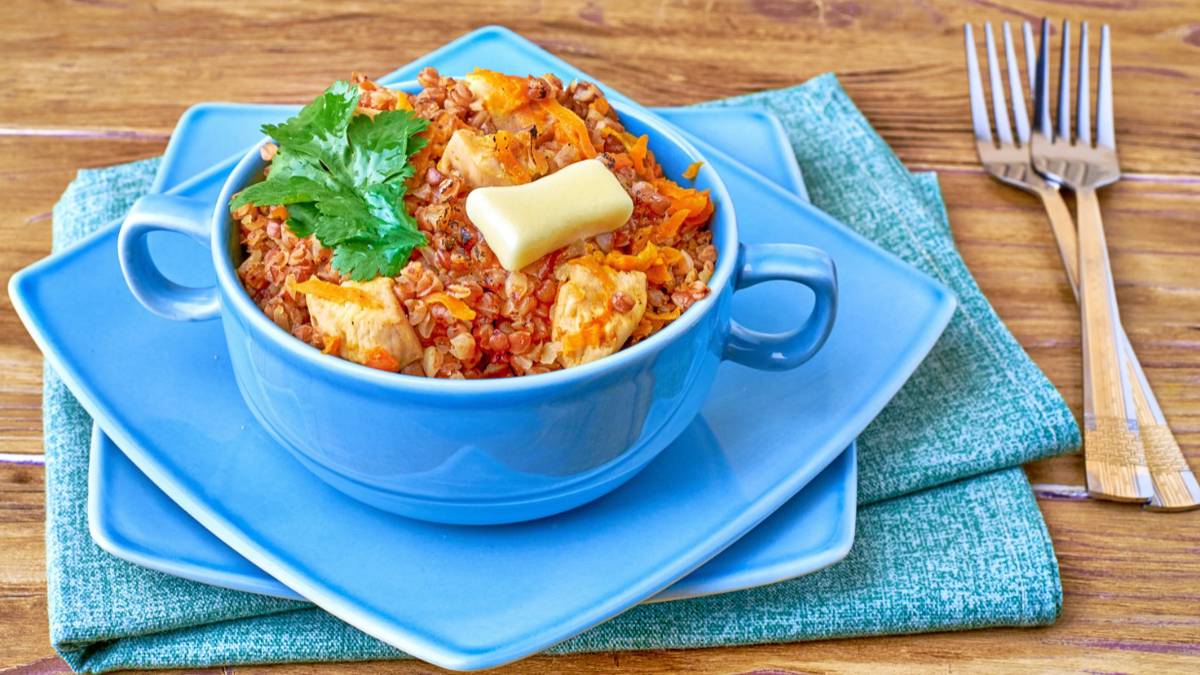 Гречку промойте и немного прокалите на сковороде. Разложите ее по горшочкам. На небольшом огне обжарьте лук и морковь до готовности и добавьте куриное филе, нарезав его на небольшие кусочки. При желании сделать блюдо более пикантным, добавьте столовую ложку томатной пасты. Теперь разложите мясо по горшочкам и долейте воду так, чтобы она покрывала содержимое горшочков на два пальца. Кстати, вместо воды можно использовать как мясной, так и овощной бульон. Разогрейте духовку до 180 градусов и поставьте горшочки на 50 минут. Перед подачей обязательно положите на кашу ломтик сливочного масла.