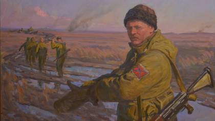 — Я увидел героя будущей картины во время своей поездки в Дебальцево в 2015 году. Подразделение возвращалось с учений и я, с разрешения военного, сфотографировал его. Замысел композиции сформировался у меня уже в мастерской На заднем плане я добавил уходящих солдат и танки, сделал закатное освещение, чтобы усилить драматизм работы. Мне важно, чтобы мои картины не были похожи на репортаж. Я стремлюсь создать яркий, выразительный образ.