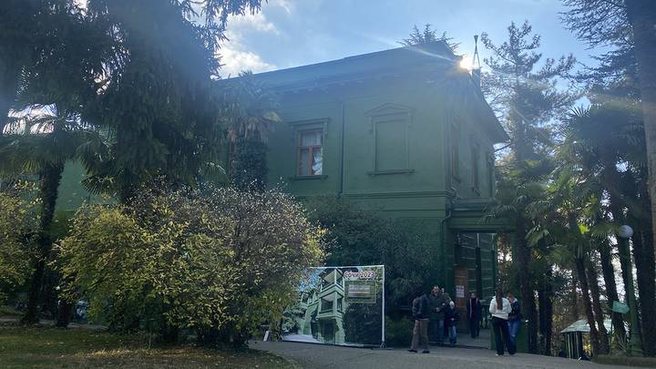 Усадьба зеленого цвета скрыта от глаз пальмами и елями. Это была любимая дача Сталина, хотя в его собственности находилось 14 других загородных домов. Участок находится на высоте 160 метров.