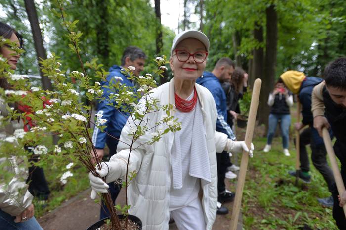 Актриса Нового театра, заслуженная артистка России Евдокия Германова с саженцем спиреи вангутты. Вместе с коллегами она высаживает кусты в парке в Люберцах