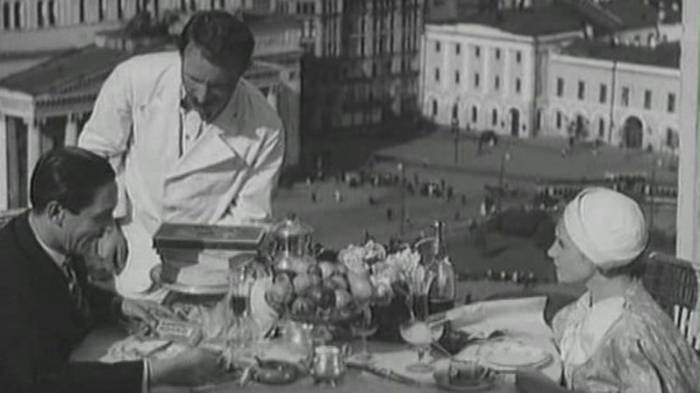 В легендарной комедии «Цирк» 1936 года есть момент, когда герои сидят в ресторане на крыше гостиницы «Москва», а за ними видно Красную площадь со всеми особенностями того времени. На кремлевских башнях еще можно увидеть дореволюционных орлов, а по самой площади идет трамвай. Более того — на пешеходном ныне пространстве оживленное уличное движение: автомобили, извозчики. Стоит Казанский собор (уничтоженный в 1936 году и ныне восстановленный. — «ВМ»).
