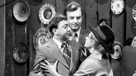 Артисты Роман Ткачук, Зоя Зелинская и Михаил Державин (в центре) в 113-м выпуске телевизионного театра миниатюр «Кабачок «13 стульев», 1977 год