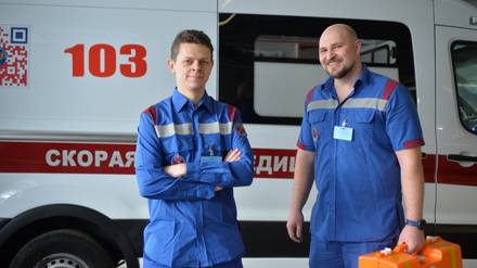 Фельдшеры бригады 41-й подстанции Скорой и неотложной медицинской помощи имени А. С. Пучкова Евгений Бригген (слева) и Андрей Свиридов, которые приехали на вызов к 87-летней Алие Османовой и оказали ей экстренную помощь