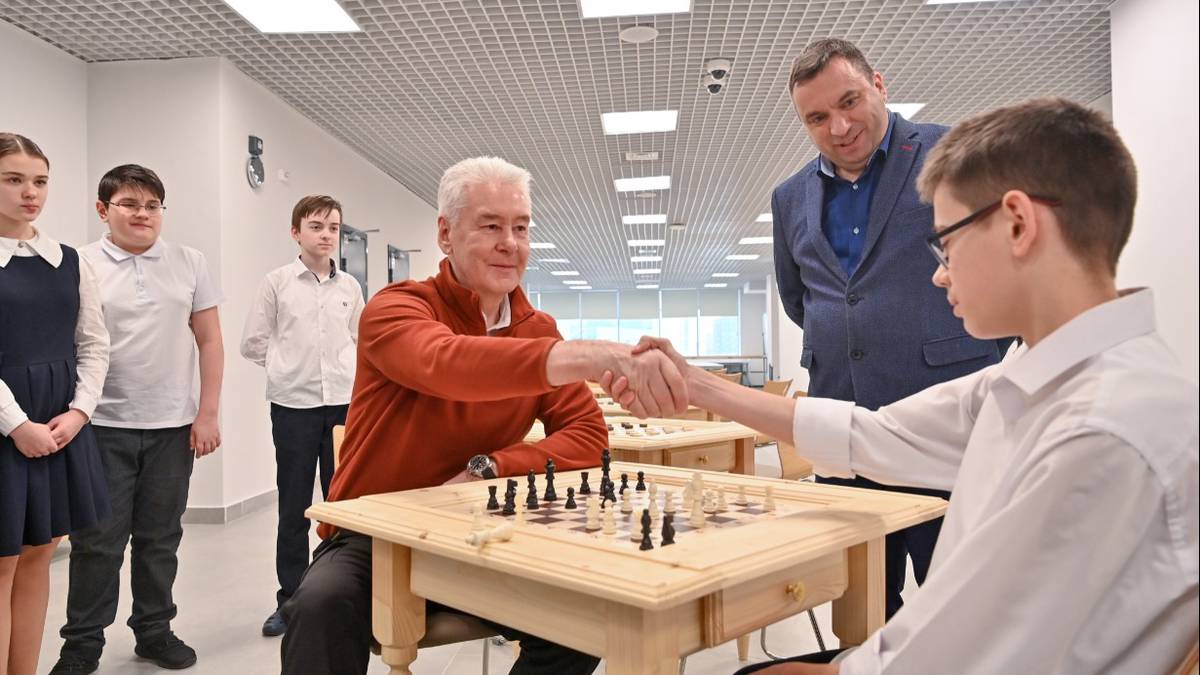 Мэр Москвы Сергей Собянин (слева) вместе с учениками и директором школы № 2122 Дмитрием Зайцевым осмотрел новый учебный корпус, где есть место и для шахматного кружка / Фото: Максим Мишин / Пресс-служба мэра и правительства Москвы