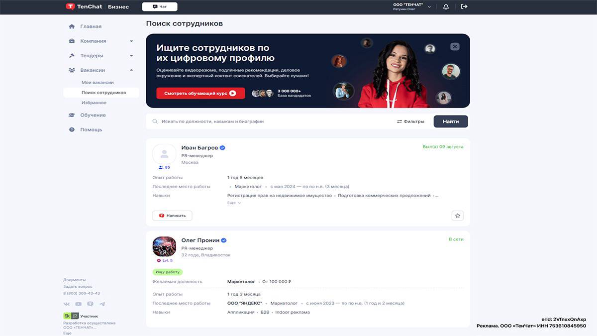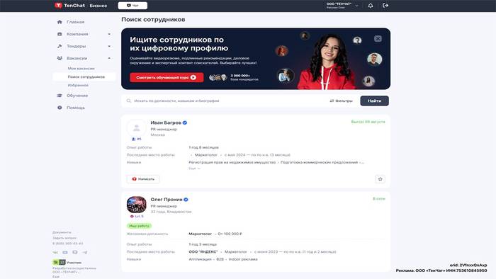 TenHunter — инновационная рекрутинговая платформа от российской соцсети TenChat. Она соединяет работодателей и кандидатов на основе принципа уберизации: профессиональные HR-агенты лично рекомендуют кандидатов и отвечают за свои рекомендации. Работодатели платят только за успешное трудоустройство. Среди клиентов TenHunter — «Т-Банк», PROInteraktiv, WinSolution, Datana, сеть аптек «Вита», маркетплейс KazanExpress и другие.