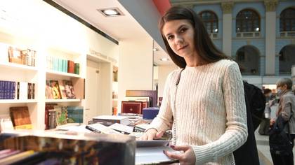 Книжный салон «Нон-фикшн». Читательница Анна Гончар выбирает новинки современных авторов / Фото: Пелагия Замятина / Вечерняя Москва