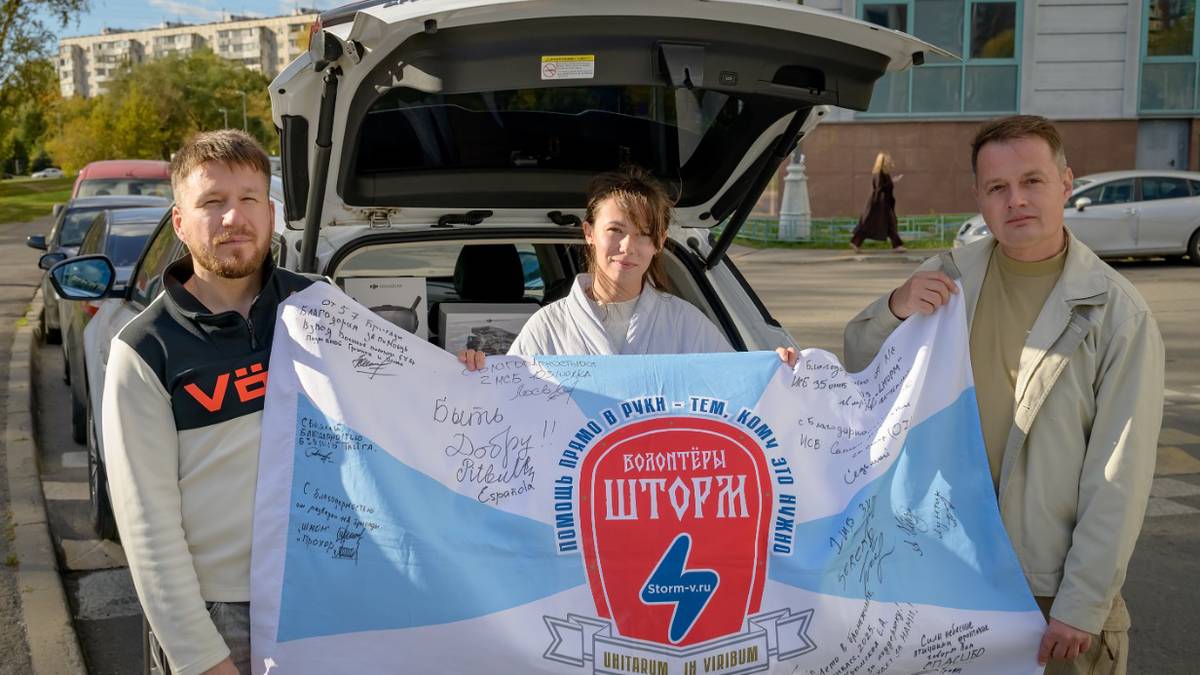 Водитель-волонтер Роман Кириллов, волонтер-медик Ольга Иванова и председатель Межрегиональной общественной организации волонтеров (МООВ) «ШТОРМ» Андрей Стрелец готовятся к очередной гуманитарной поездке на Донбасс