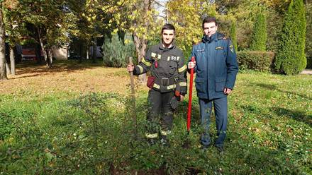 Пожарные ПСЧ № 51 принялись за дело. Младший сержант внутренней службы Усман Гаршаев и капитан внутренней службы Артем Клоков уже выкопали ямки и аккуратно достают саженцы из горшков.