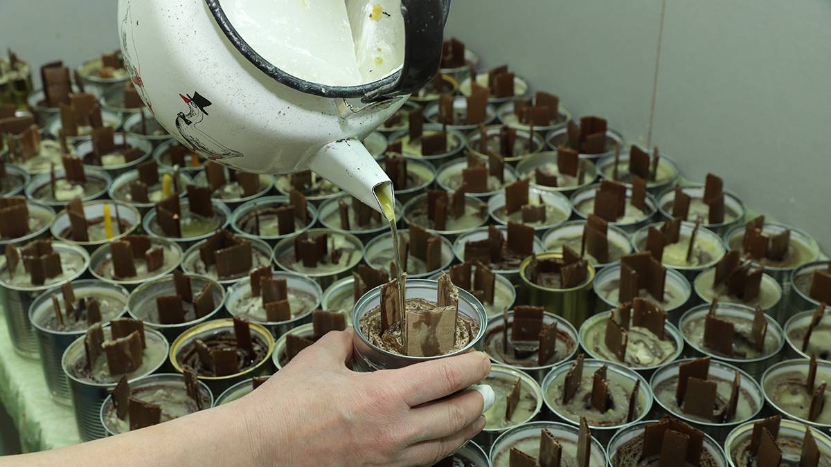 Цех по производству окопных свечей расположился в палатке на заднем дворе храма. В центре палатки установлен 70-литровый воскоплав, перерабатывающий остатки церковных свечей. Их затем смешивают с парафином в соотношении один к двум. Полученную жидкость переливают в жестяную банку с картонным фитилем.