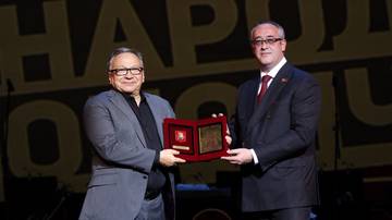 Председатель Мосгордумы Алексей Шапошников награждает народного артиста России, режиссера Игоря Угольникова за вклад в сохранение памяти о Московском народном ополчении 1941 года