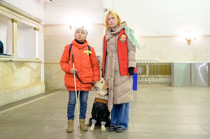 У станции метро «Проспект Мира» незрячих москвичей встречают волонтеры. Пришедшим аккуратно прикрепляют яркие ленточки к верхней одежде и выдают карточки: в них участники будут собирать отметки о прохождении маршрута с выполнением различных заданий по пути.