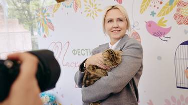 Председатель Комитета общественных связей и молодежной политики города Москвы Екатерина Драгунова держит на руках кошку из приюта