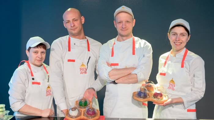 Участники VIII ресторанного фестиваля «Кухня Рязанского края»: шеф-кондитер Наталья Васильева, шеф-повар Михаил Барабанщиков, шеф-повар Виталий Левычкин, сушеф Мария Сальникова готовят калинник