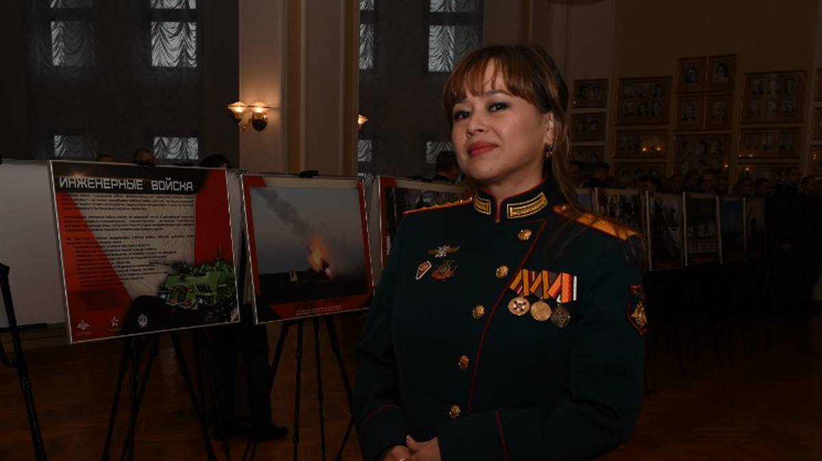 Старший прапорщик Айгуль Тургунбаева на фоне фотовыставки, посвященной инженерным войскам. Экспозицию развернули в фойе Центрального академического театра Российской армии