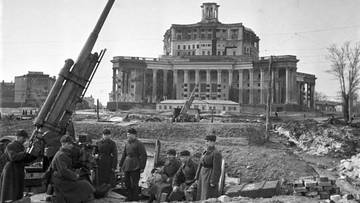 Битва за Москву. Батарея 76,2-мм зенитных пушек З-К перед Театром Красной Армии (ныне — Центральный академический Театр Российской Армии). Во время налетов на Москву в 1941 году погибло более 2000 человек, были повреждены или разрушены 5584 жилых здания, 90 госпиталей, 253 школы...