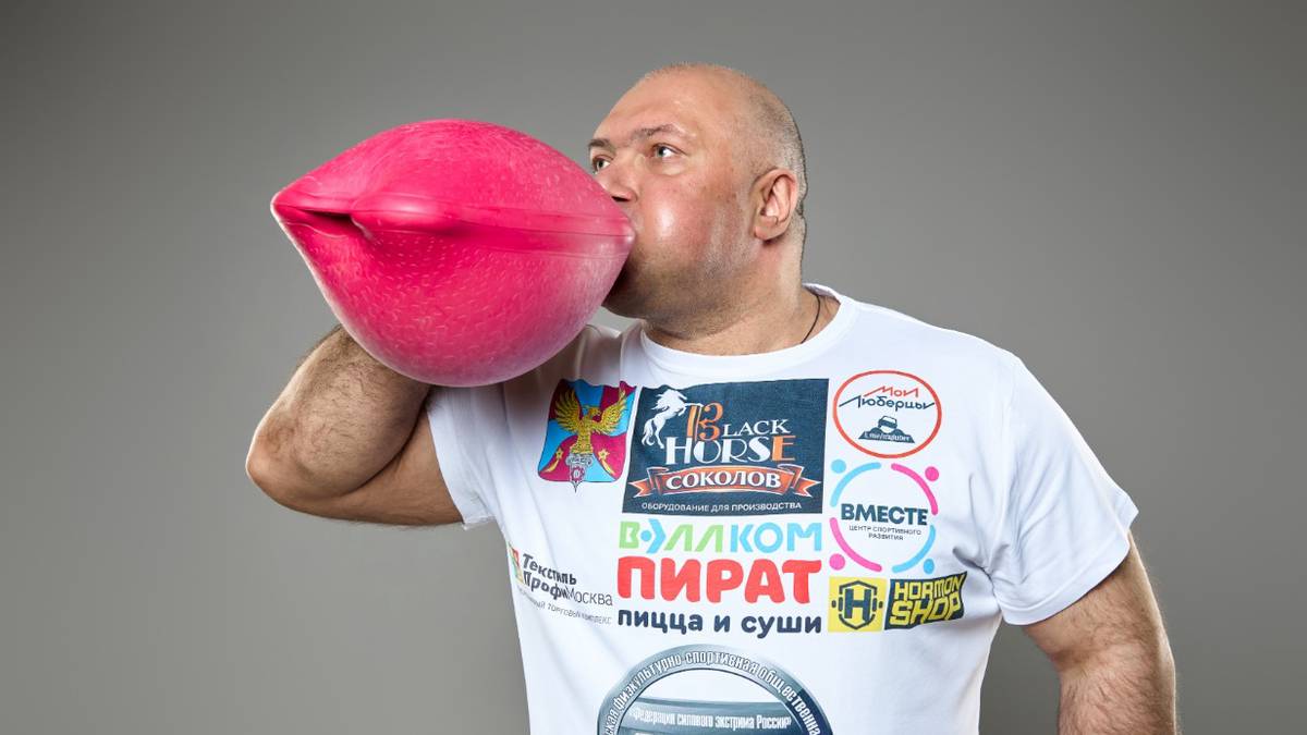 Вице-президент Федерации силового экстрима России, рекордсмен мира Сергей Агаджанян надувает грелку
