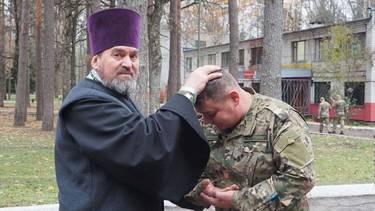 Командир взвода добровольческого отряда «БАРС-Брянск» и батальонный священник Александр Беликов благословляет одного из военнослужащих перед очередным боевым заданием