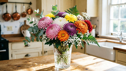Хризантемы считаются одними из самых стойких цветов. Кустовые или одноголовые, они могут сохранять свежесть до двух, а иногда и трех недель. Цветы хорошо переносят перепады температуры и транспортировку. Главное правила ухода за ними — регулярно менять воду и подрезать стебли. Тогда букет простоит максимально долго.