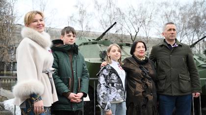 28 марта. Муниципальный депутат Кристина Дзямулич, дети из Донецка Владислав Хомич и Дарья Тарасенко, председатель Совета ветеранов Мещанского района Валентина Шурыгина и советник ректора НИУ «ВШЭ» Олег Леонов (слева направо) на мероприятии «День добрых встреч» / Фото: Пелагия Замятина / Вечерняя Москва