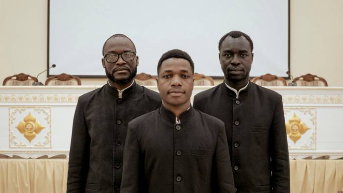 Семинаристы Николо-Угрешской православной академии Паоло Эстэфанэ Сибиндэ, Окот Сандой и Мева Омар Бени в актовом зале семинарии / Фото: Виктория Филатова