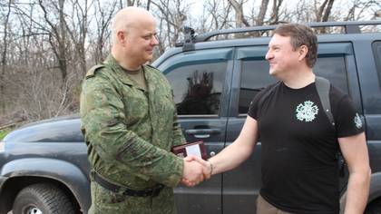 Спецпредставитель Союза театральных деятелей России Руслан Банковский вручил медаль СТД «Спасаем Веру и Отечество» заместителю командира по военно-политической работе 201-го отдельного стрелкового полка 7-й отдельной гвардейской мотострелковой Чистяковской бригады с позывным «Туча» / Фото: Андрей Объедков