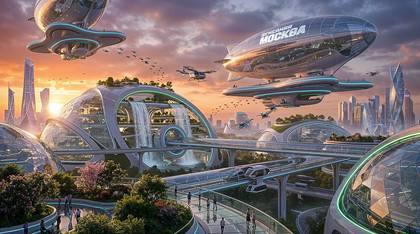 Мы ведем репортаж из Центрального Аэроузла столицы, где граница между городом и небом окончательно стерлась. Главный терминал аэропорта будущего — это живой организм. Массивные стеклянные купола укрывают многоуровневые террасы. Здесь архитекторы совершили невозможное: прямо из стен футуристических конструкций срываются каскады водопадов, увлажняя воздух и создавая прохладу в лучах вечного заката. Пассажиры прогуливаются по парящим мостам-променадам, утопающим в зелени сакур. Главная гордость столичного флота — дирижабль «Вечерняя Москва». Он дрейфует над шпилями, предлагая круизы высшего класса.