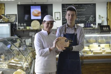 Эльвира Ковтун и ее сын Денис показывают сыр сорта «Пещерный» собственного производства. Это единственный из российских сыров, который завоевал золотую медаль на престижном международном конкурсе World Cheese Awards / Фото: Наталья Феоктистова / Вечерняя Москва