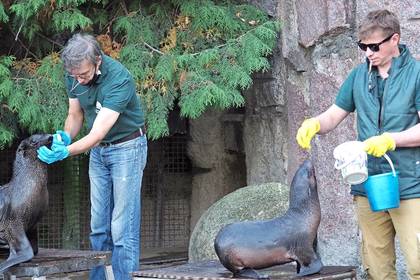 Обучающее мероприятие для сотрудников в самом разгаре. Вокруг вольера с ластоногими собрались и посетители зоопарка. Наблюдаю, как кипер Николай Герц кормит рыбой большого морского котика Пирата. Его собрат поменьше, Грейс, ныряет с тумбы за обручем и приносит его своему киперу — Андрею Самарцеву.