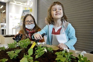 Специально на необычный субботник пришла семья Воробьевых. Маленькая Вика охотно орудовала лопаткой, высаживая различные растения в мобильные контейнеры, которые впоследствии украсят крыши районных центров.