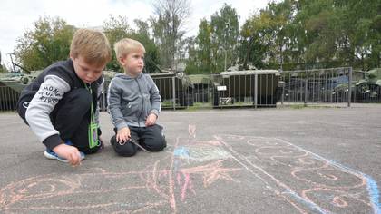 Юные москвичи Дмитрий и Даниил Ключниковы (слева направо) пришли в Центральный музей Вооруженных Сил России, чтобы отпраздновать День танкиста. Ребята поучаствовали в конкурсе рисунков на асфальте. Они изобразили цветными мелками легендарный танк Т-34 / Фото: Пелагия Замятина / Вечерняя Москва