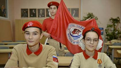Ученики 9-го «К» юнармейского класса школы № 1636 «Ника» Арсений Евдокимов, Карина Бессарабова и Анастасия Ратникова. Ребята состоят в отряде «Тайфун», флаг которого и держит в руках Анастасия / Фото: Наталья Феоктистова / Вечерняя Москва