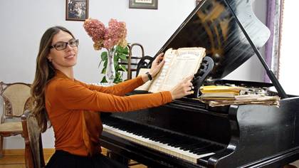На пюпитре стоят пожелтевшие листы бумаги с напечатанными на них нотами. Они — ровесники отреставрированного рояля, который, поблескивая лакированными боками, стоит в музыкальной гостиной. Посетители могут до мельчайших деталей разглядеть резные ножки и «внутренности» инструмента.