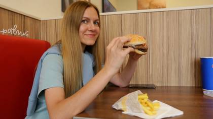 Москвичка Ольга Клименкова решила быстро подкрепиться бургером и картошкой фри в популярной сети быстрого питания / Фото: Анатолий Цымбалюк / Вечерняя Москва