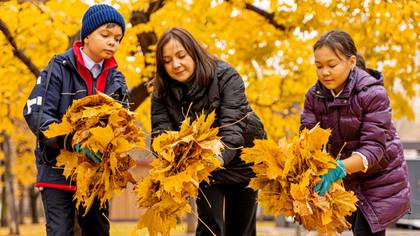 Соцпедагог школы № 2055 Ирина Дмитриева собирает листья с учеником Денисом Поповым / Фото: Анна Темнышова / Вечерняя Москва