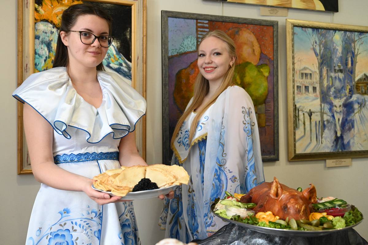 Участницы гастрономического фестиваля Дарья Калинникова (слева) и Екатерина Баранова демонстрируют рождественские блюда — блины и отварного поросенка / Фото: Алексей Орлов / Вечерняя Москва