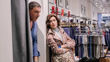 Герои Максима Виторгана и Марины Петренко сталкиваются в магазине, выбрав один подарок / Кадр из фильма «День слепого Валентина» / 2022 года