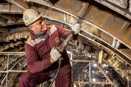 Бригадир чеканщиков Максим Бережной работает в тоннеле станции «Рижская» Большого кольца метрополитена / Фото: Александр Попов