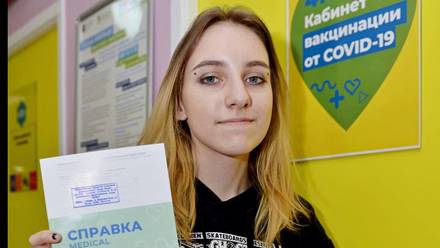 Школьница Полина Русанова держит в руках справку о вакцинации от новой коронавирусной инфекции. Прививку она сделала в детской поликлинике № 39