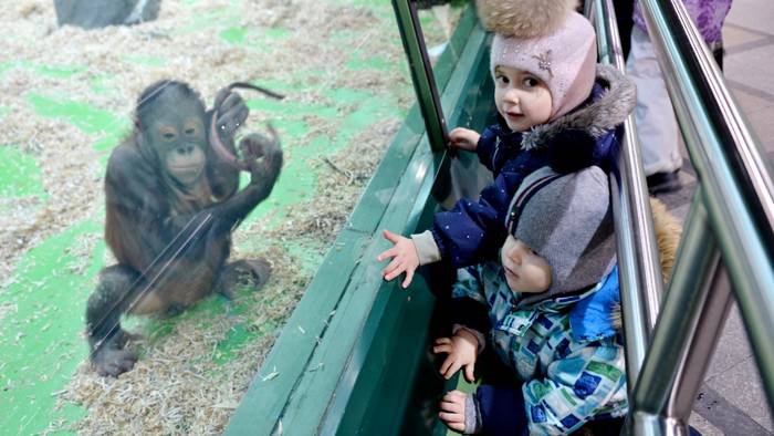 Юные москвичи Анна и Алексей Бикмухамедовы наблюдают за борнейским орангутангом Матику, который живет в одном из павильонов столичного зоопарка. У примата, кстати, тоже скоро день рождения. В марте обезьяне исполнится четыре года
