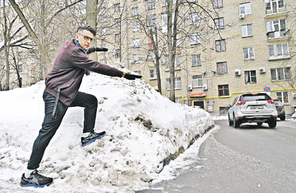 Вторую проблему этого двора замечаем тоже практически сразу. В центре территории расположена прогулочная зона, но выход из нее ведет прямо на дорогу. Нет никаких знаков, ограничителей. Ситуацию осложняет еще и высокий сугроб — не меньше 150 сантиметров, за которым человека, а уж тем более ребенка, будет не видно. Причем летом вместо сугроба здесь высокий кустарник, который тоже заграждает видимость.